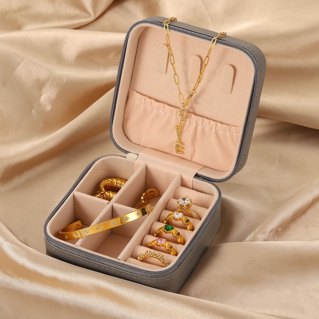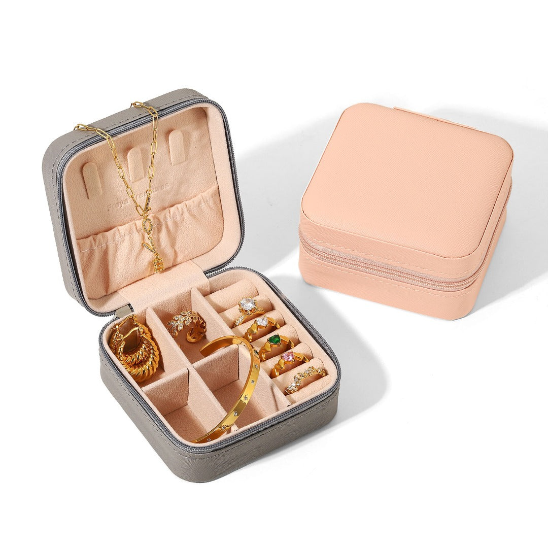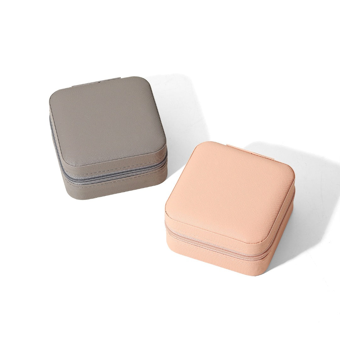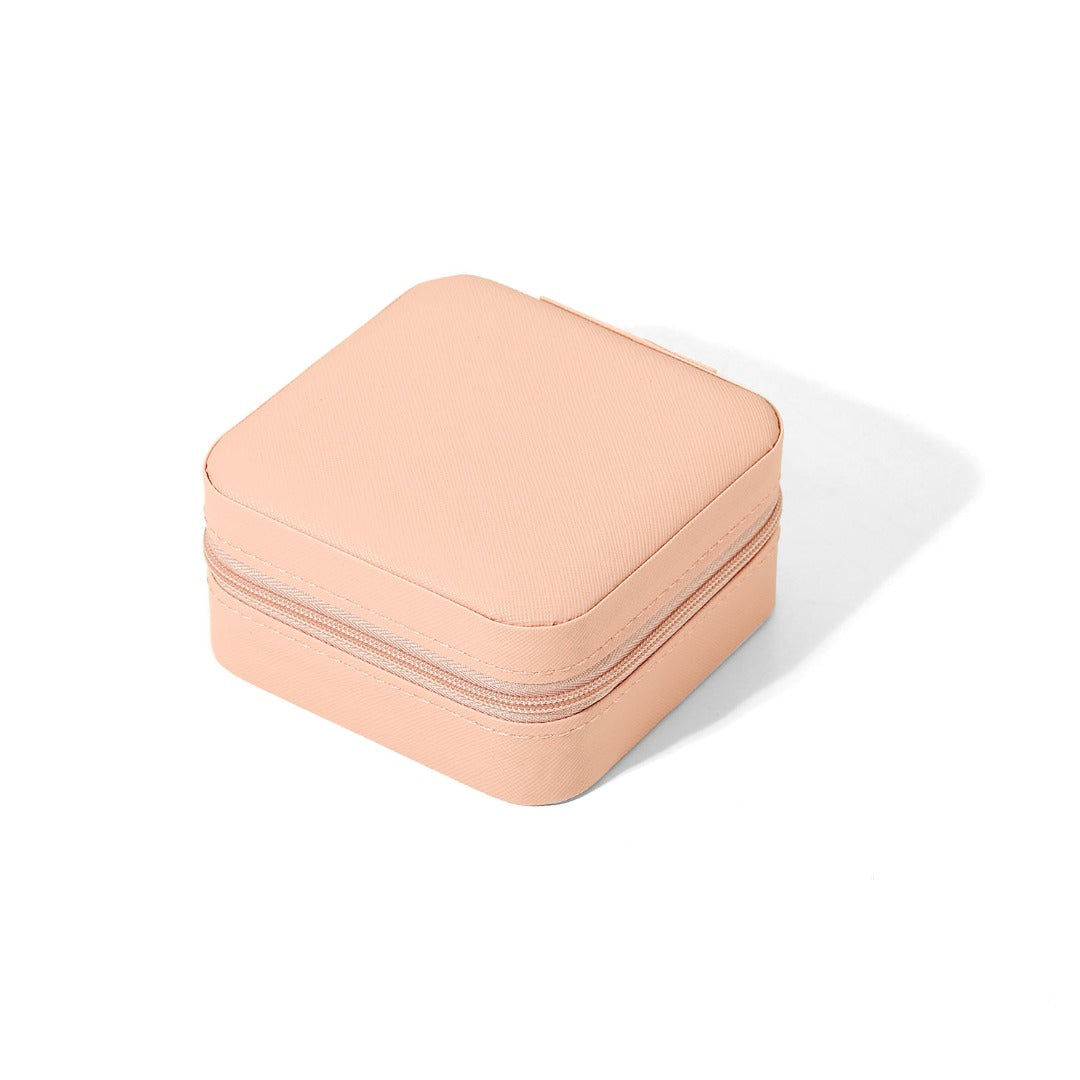 • A compact jewelry box in deep pink vegan leather & beige velvet lining