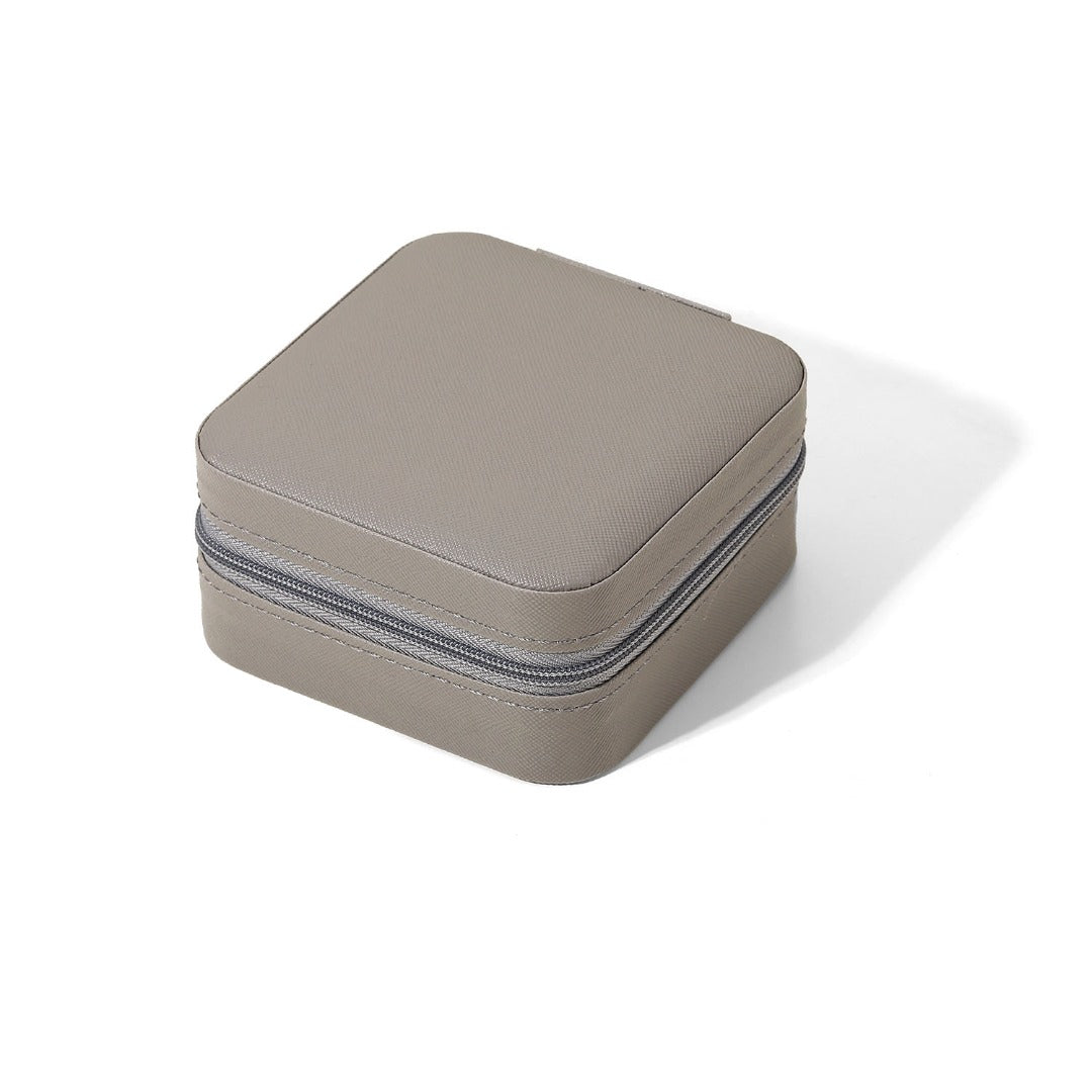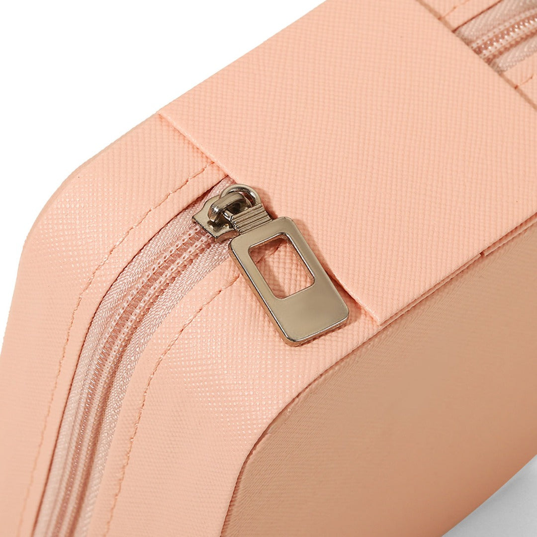 Compact and elegant, our deep red travel jewelry case is thoughtfully designed to fit all your jewelry storage needs, at home or away. Its attractive, sleek style is crafted from a combination of smooth vegan leather and soft pink velvet lining. The travel-ready jewelry case comes with a mirror surrounded by stud earring holes, hooks and a storage compartment, lined ring rolls, and separated compartments for all your accessories. Lightweight and elegant, the case keeps your jewelry secure with a metal zipper closure. This deluxe jewelry case is also available in blue.