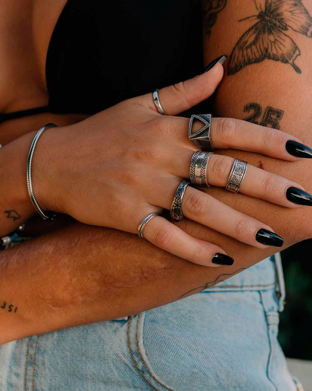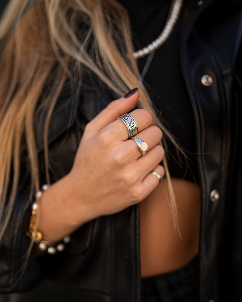 The Melville ring is a 925 sterling silver band featuring an engraving of a repeating pattern. This is an amazing ring to add to your collection or to enter the world of jewellery. The name of this ring comes from its inspiration: the philosophy of life of the poet Herman Melville (world famous for his work Moby Dick). The writer considered travel to be the true condition of man. We recommend pairing it with the Portofino ring for a classic ring combination.