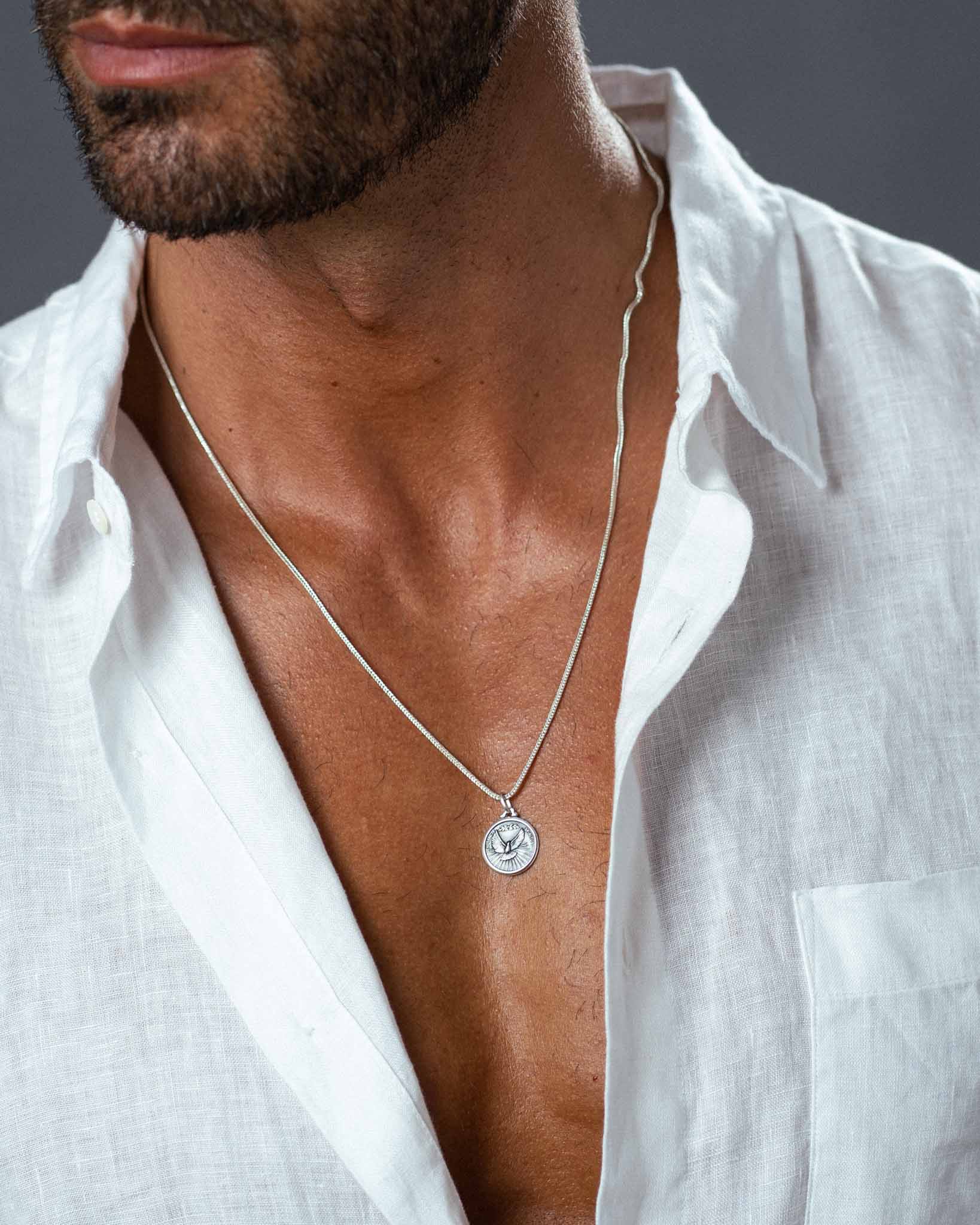 Bali silver chain with pendant of Holy Spirit. Wear this necklace as a reminder that the Holy Spirit will always be with you. Allow this pendant to give you the strength you need to face all of life's challenges. Double engraved religious pendant with the engraving of the prayer 'Veni Sancte Spiritus' which means 'Come Holy Spirit' in Latin. Wear it alone or combine it with the Cali silver chain for a more irreverent look.