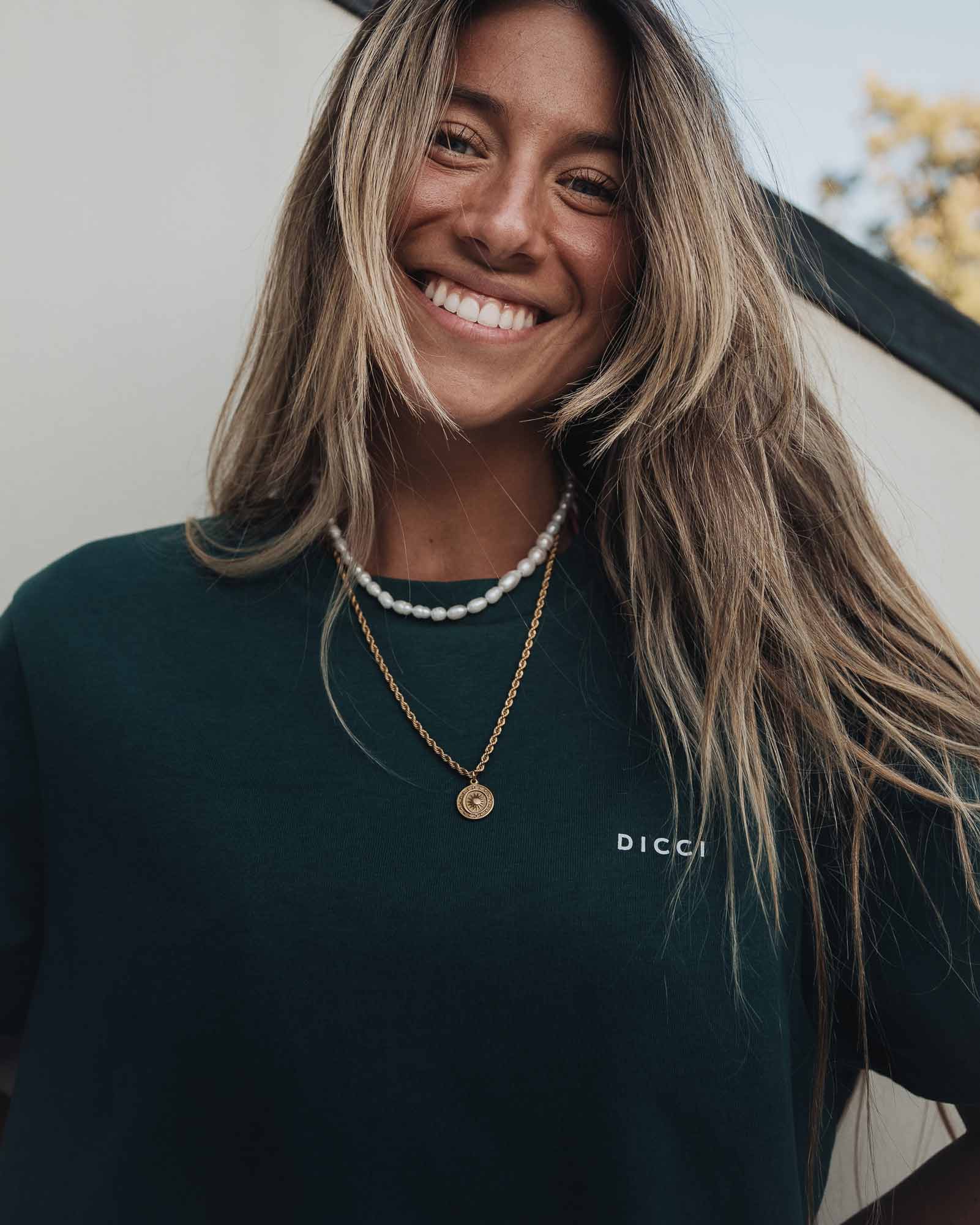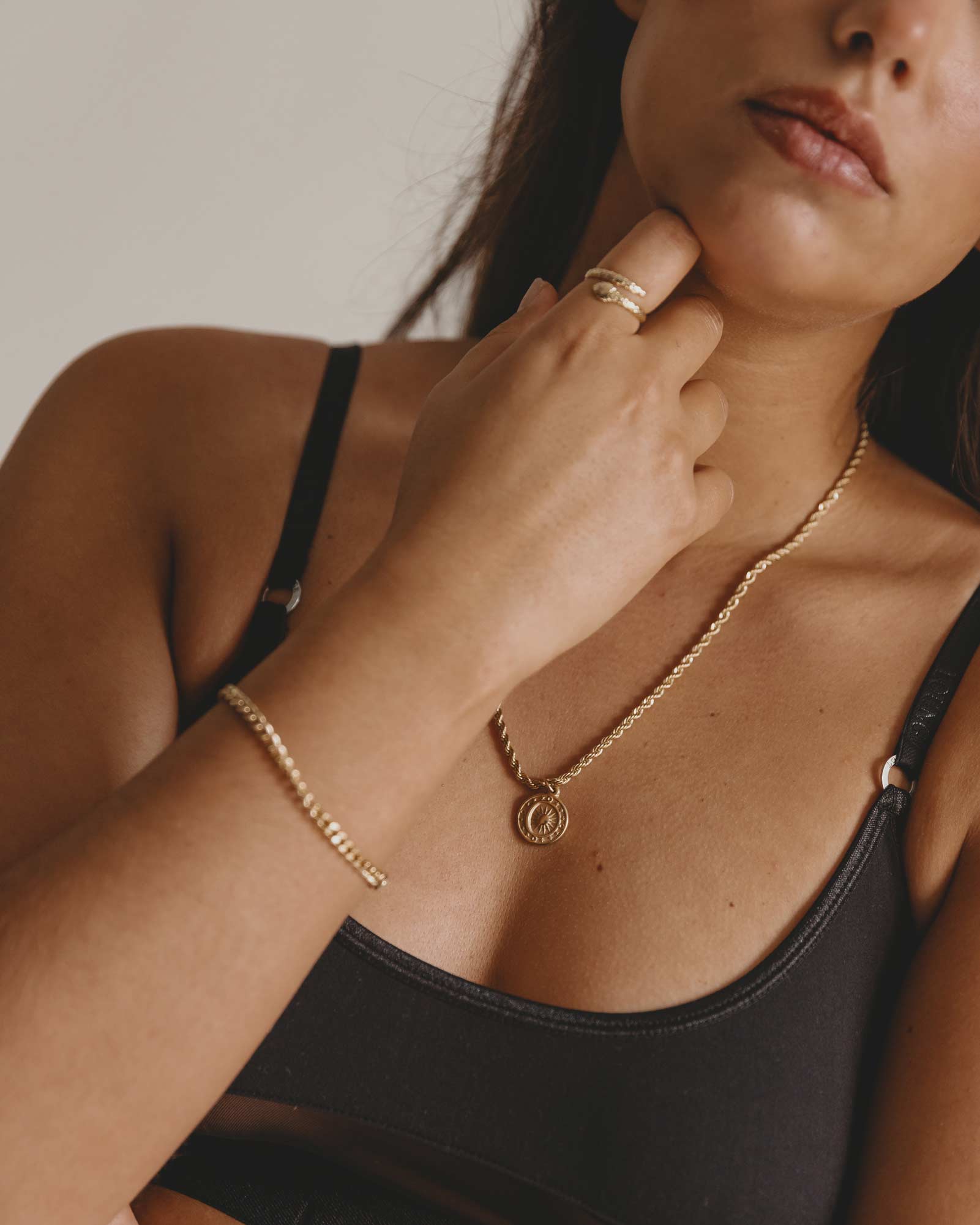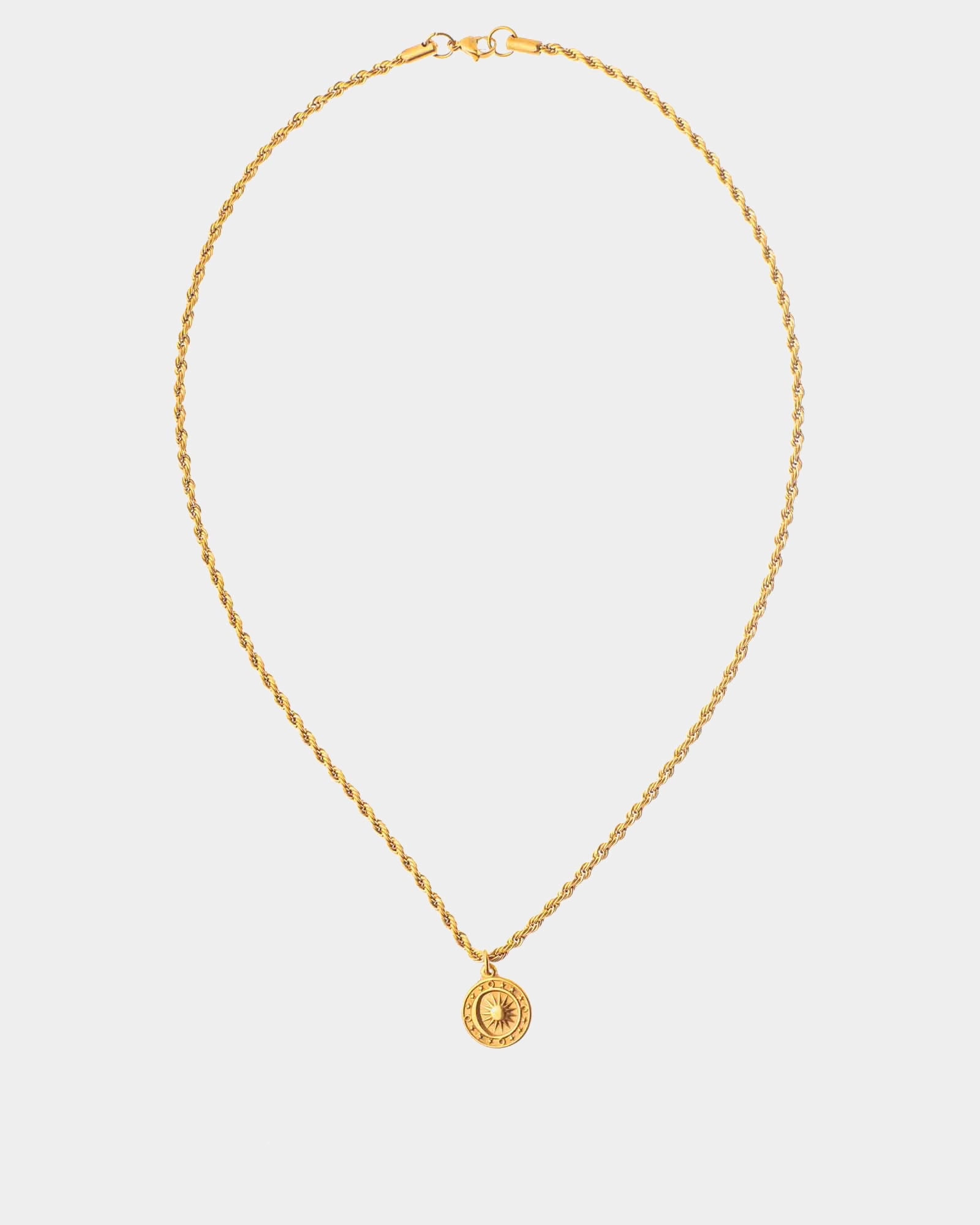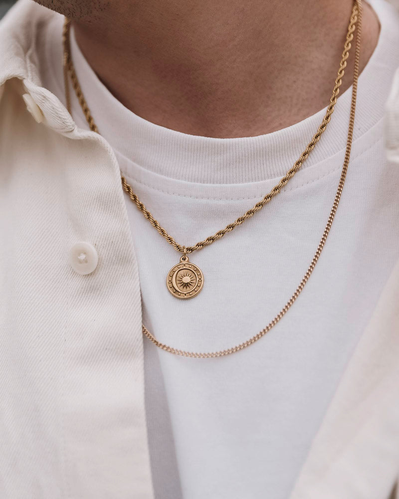 Gold Raso necklace with sizigia pendant. Made of stainless steel, this gold plated chain with detailed work is a classic that you want to have in your accessory collection. With the sizigia pendant, which means the conjunction or opposition of a planet, especially the moon with the sun, is perfect for a balanced style. it can also be conjugated with other pendants . You decide.